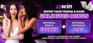 At 22Win online casino, sharing the gaming fun with friends is a win-win situation. When you refer a friend, you’ll not only receive an extra ₱100 bonus but also earn a referral commission of 0.7%. So, gather your pals together at 22Win casino!